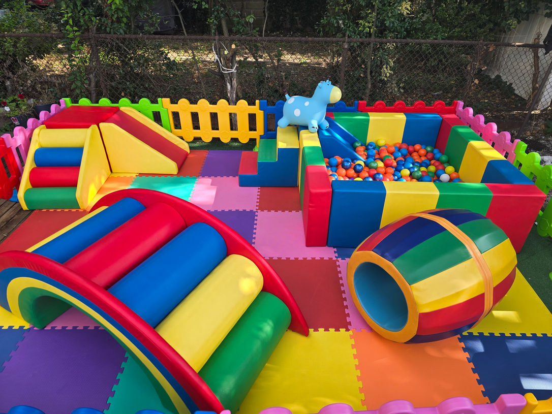 Take playtime to the next level! this deluxe setup includes a 5'x5' ball pit, tunnel roller, climber and slides, and plenty of vibrant play pieces to keep kids moving and engaged. With bold primary colors and extra play elemants, it's the ultimate adventure for bigger celebrations. (Mats and gates included in price, gates are optional)